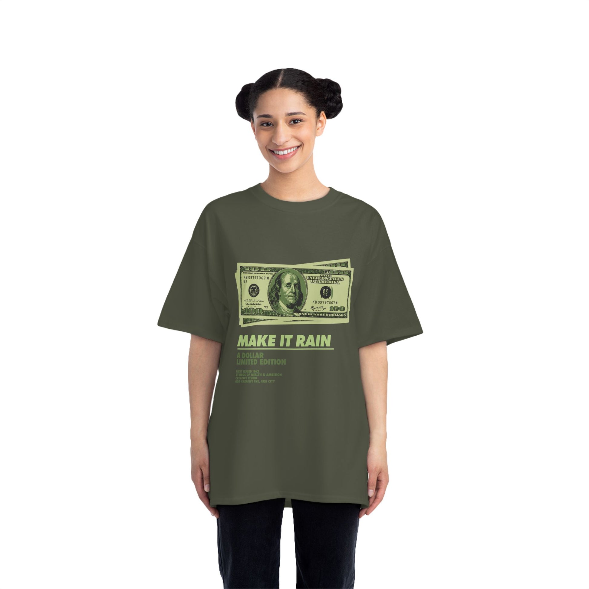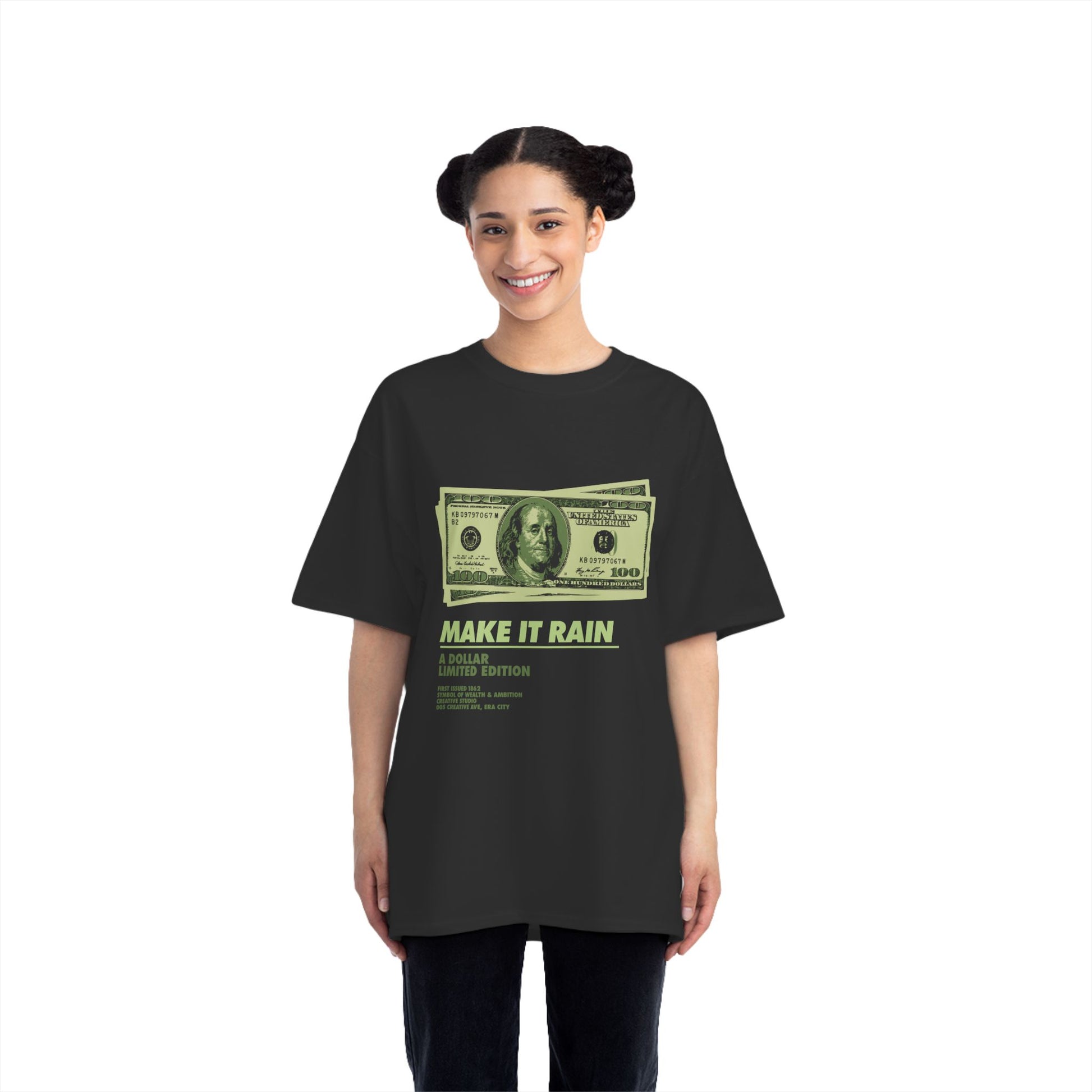 💸 High-contrast print – bold green money graphic and “MAKE IT RAIN” text with sharp detail.